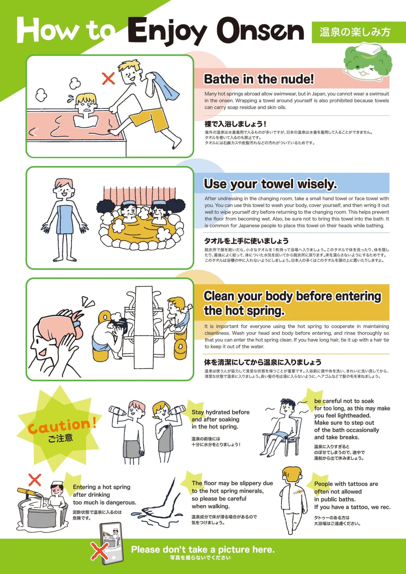 เมื่อคุณไปออนเซ็นหรือโรงอาบน้ำสาธารณะ คุณควรเตรียมถอดเสื้อผ้าในห้องเปลี่ยนเสื้อผ้าก่อนแล้วจึงค่อยเข้าสู่บริเวณอาบน้ำ เนื่องจากทุกคนจะลงในอ่างน้ำขนาดใหญ่เดียวกัน คุณควรล้างตัวก่อนลงแช่ในอ่าง ไม่ควรนำผ้าขนหนูลงในอ่างน้ำและห้ามปล่อยน้ำทิ้ง